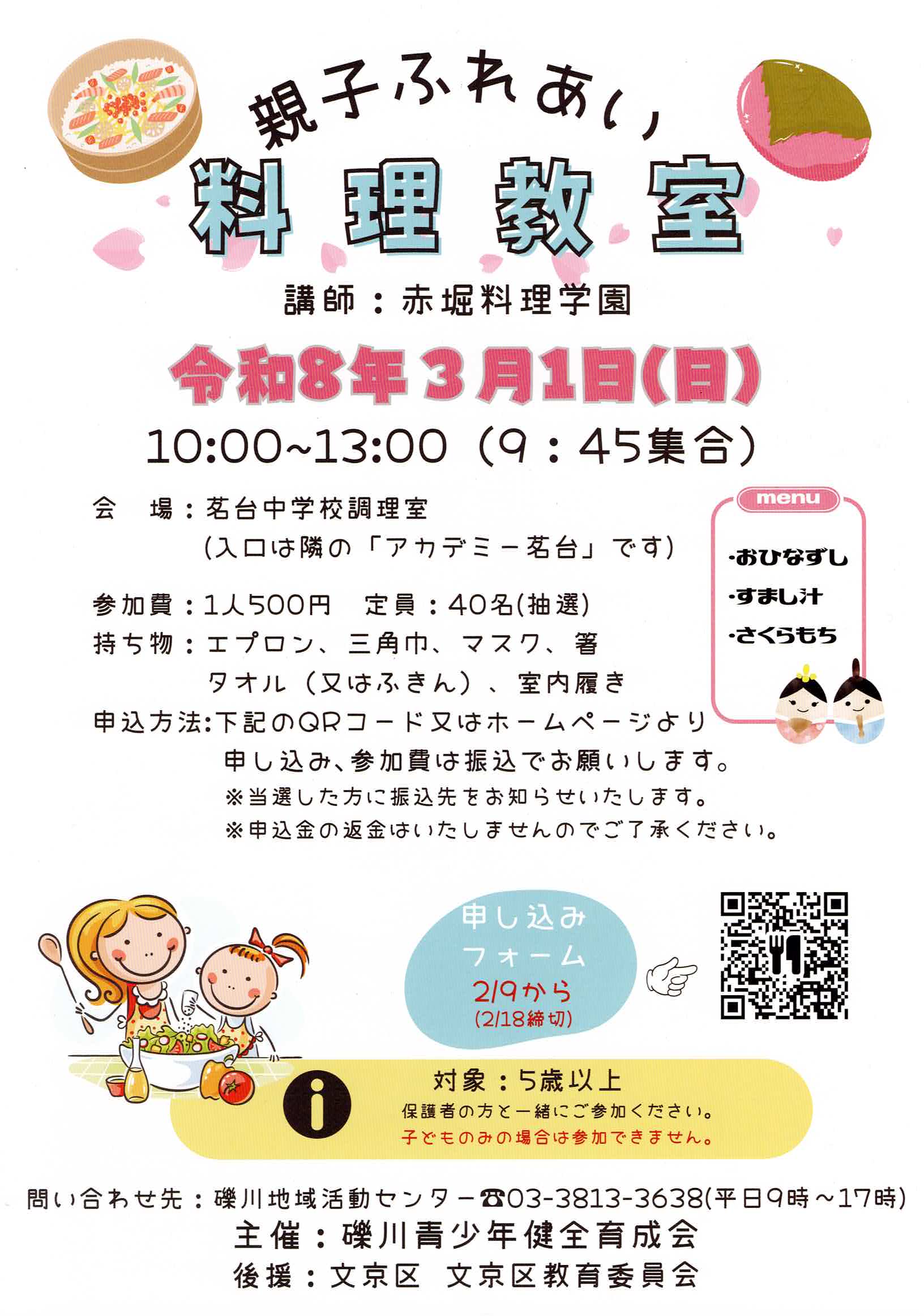 令和8年3月1日親子ふれあい料理教室開催 投稿日: 2026年2月10日2026年2月10日 投稿者: shiraishi 『親子ふれあい料理教室』 ⇩今回のメニューは⇩ 🎎お雛寿司🎎 🍀すまし汁🍀 🌸桜もち🌸 申込締め切りは2/9💕